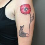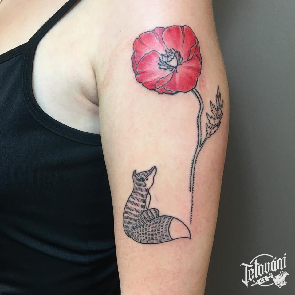 Tetování zvířata, liška a květina, vlčí mák na rameno
