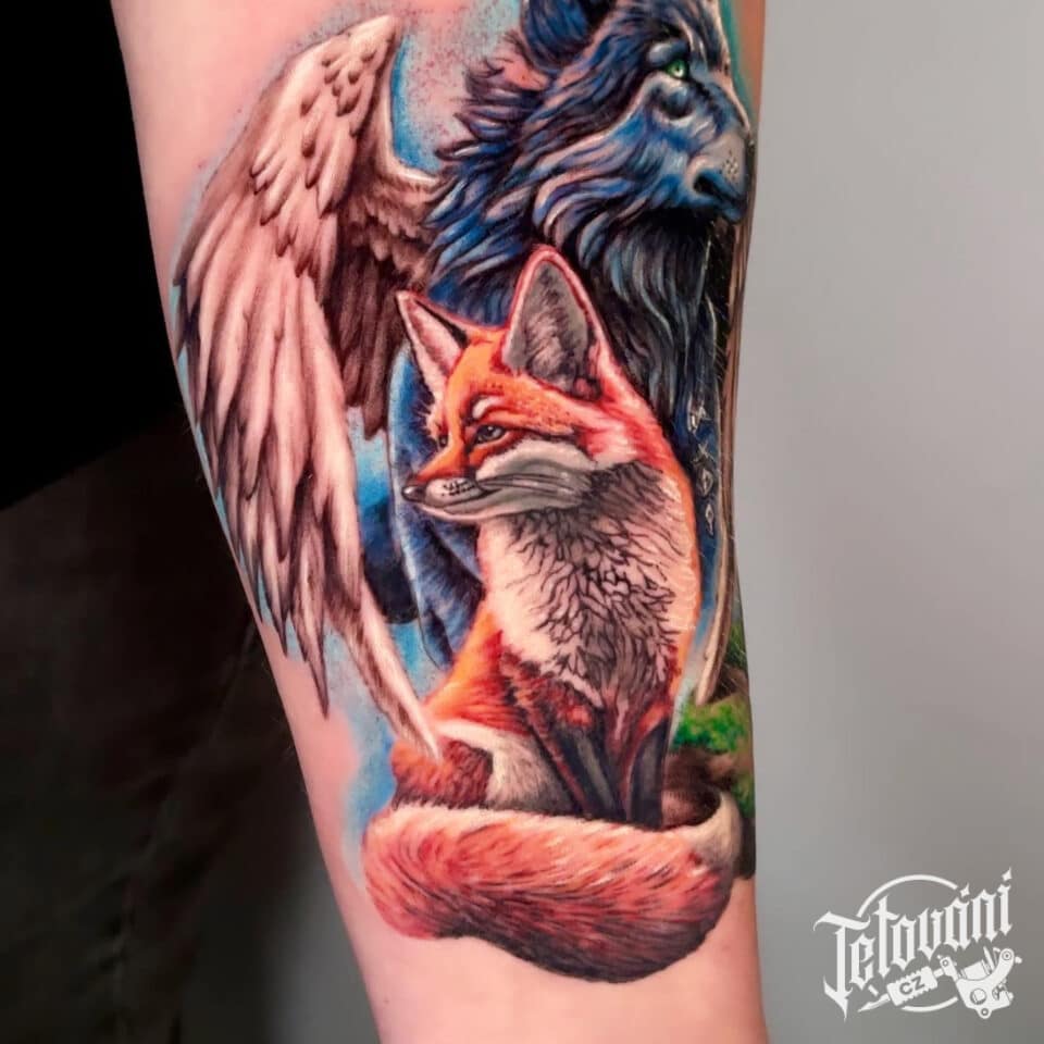 Tetování zvířata, liška, vlk, křídla, příroda na předloktí