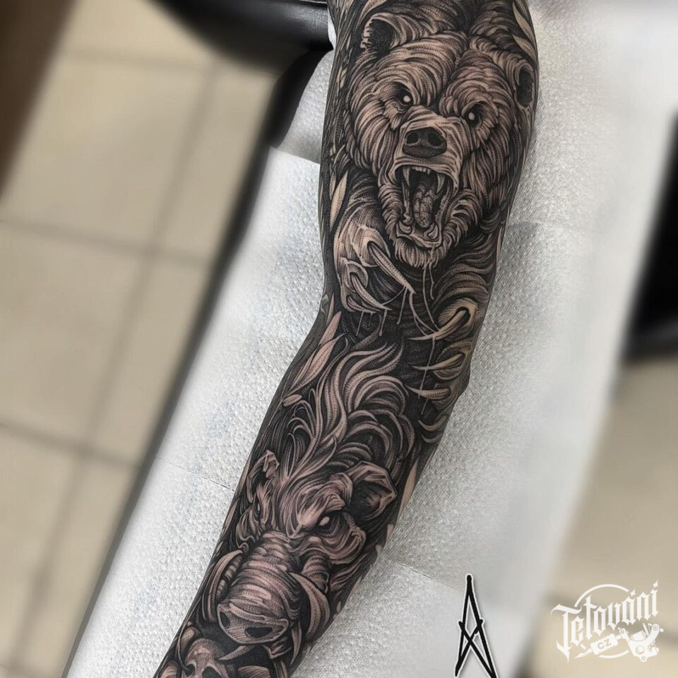Tetování zvířata, medvěd a divoké prase, rukáv