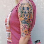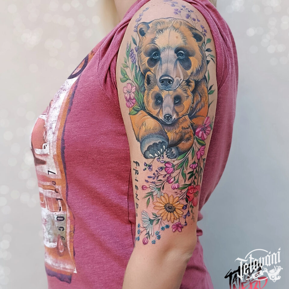 Tetování zvířata, medvědice s mládětem, květiny na paži