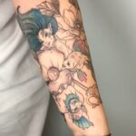 Tetování zvířata, mořská panna a ryby na předloktí