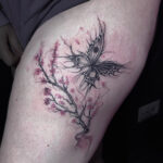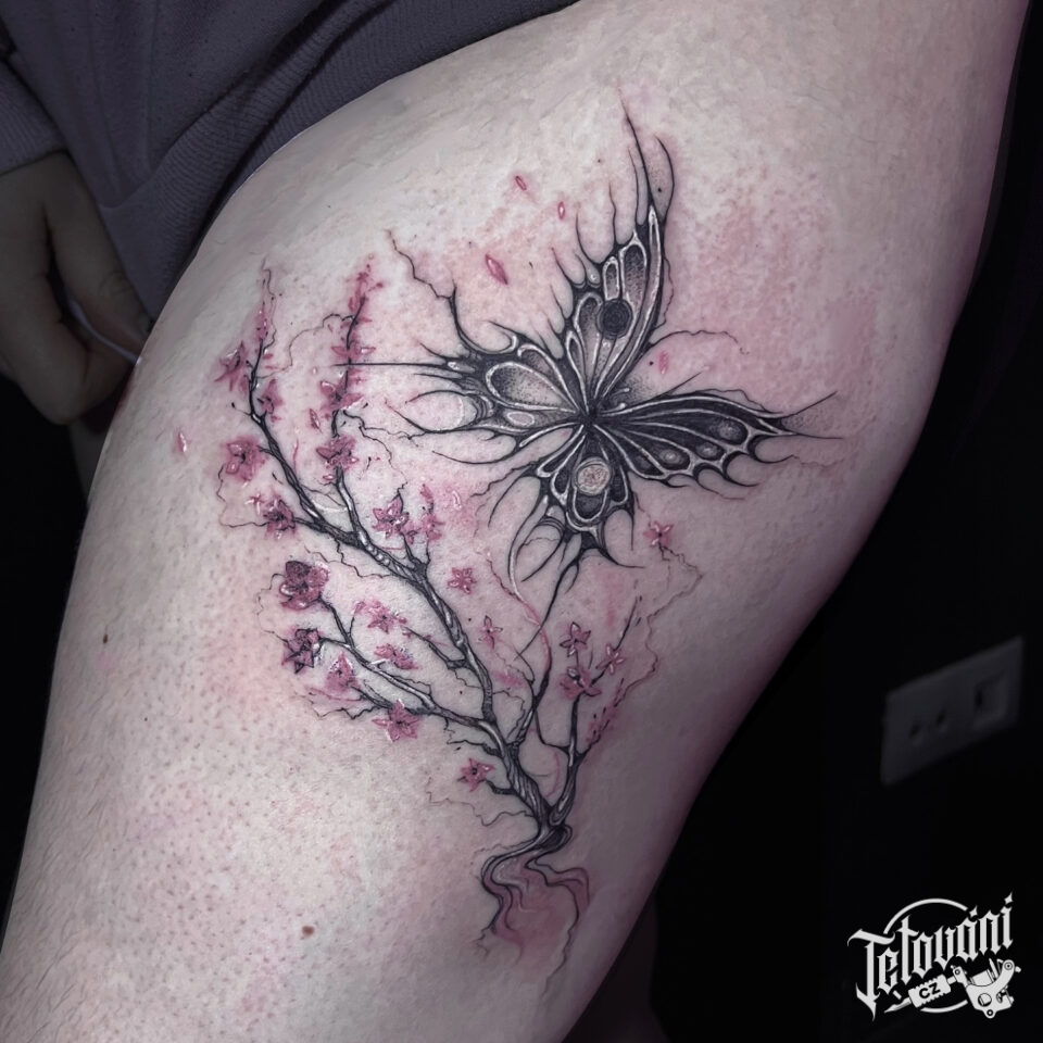 Tetování zvířata, motýl a květiny, sakura na stehno