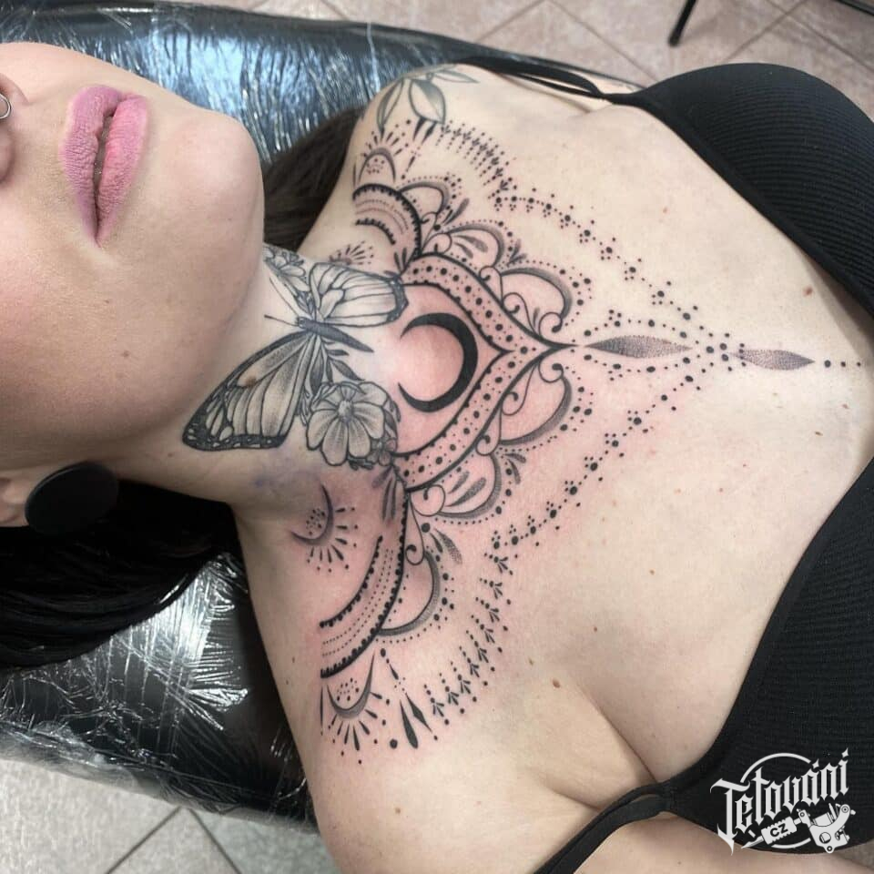 Tetování zvířata, motýl a mandala na hrudi