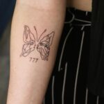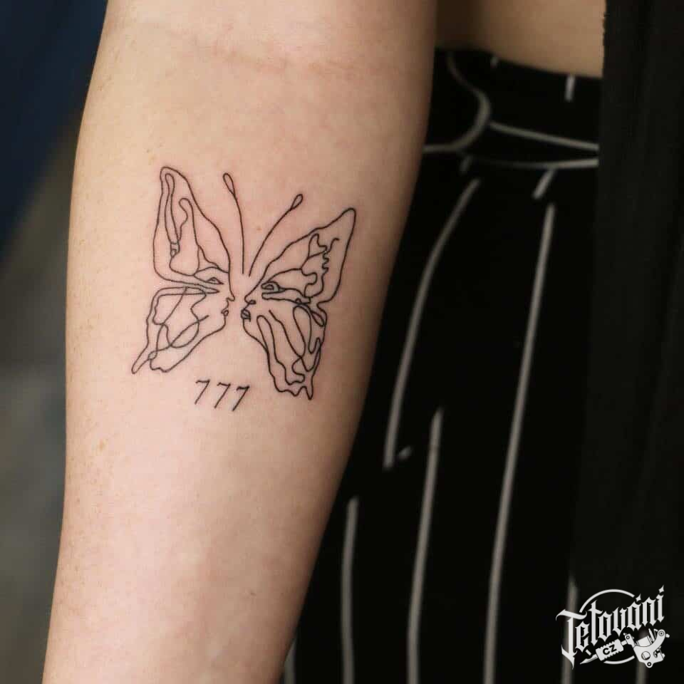 Tetování zvířata, motýl a nápisy, čísla na předloktí
