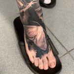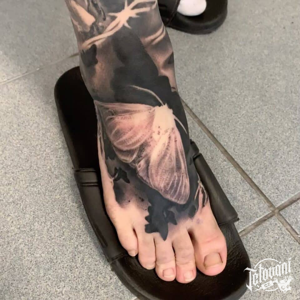 Tetování zvířata, motýl a ostnatý drát na noze