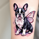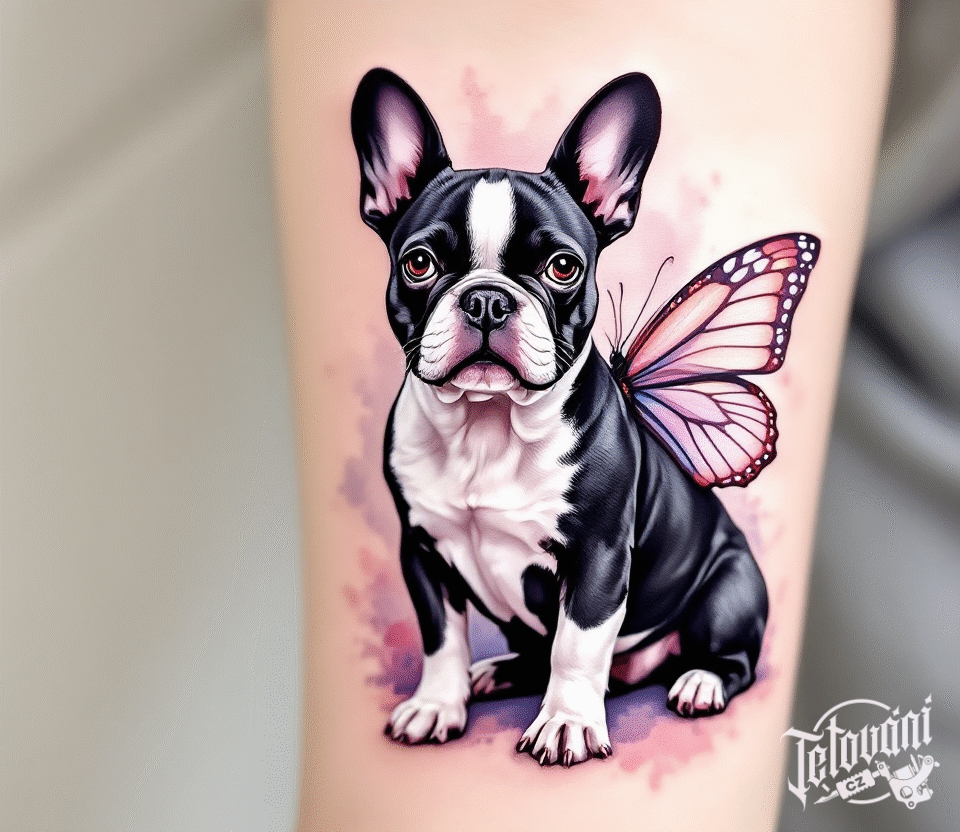 Tetování zvířata, motýl a pes, francouzský buldoček na předloktí