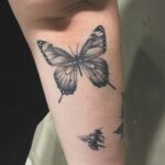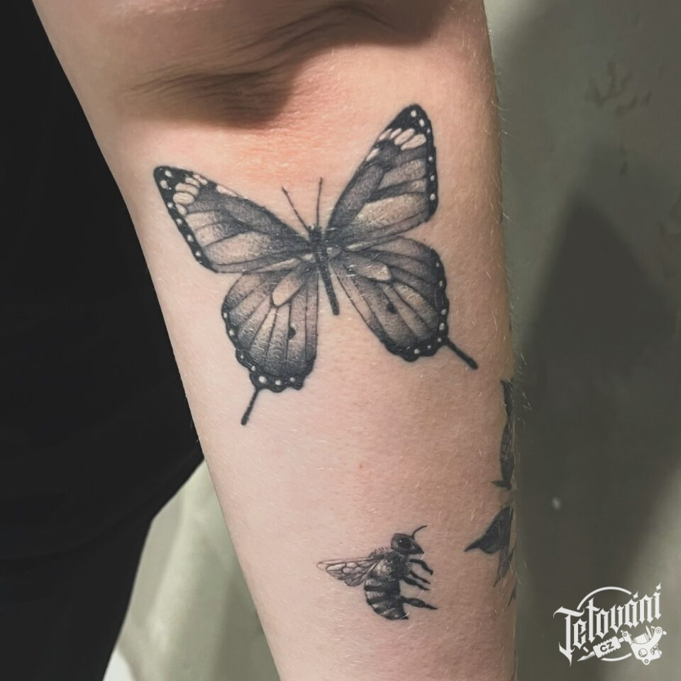 Tetování zvířata, motýl a včela na předloktí
