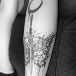 Tetování zvířata, motýl, meč a měsíc na lýtko
