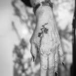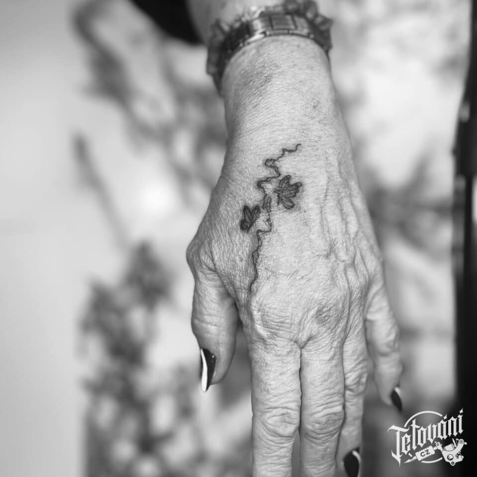 Tetování zvířata, motýli a čára na hřbetu ruky