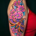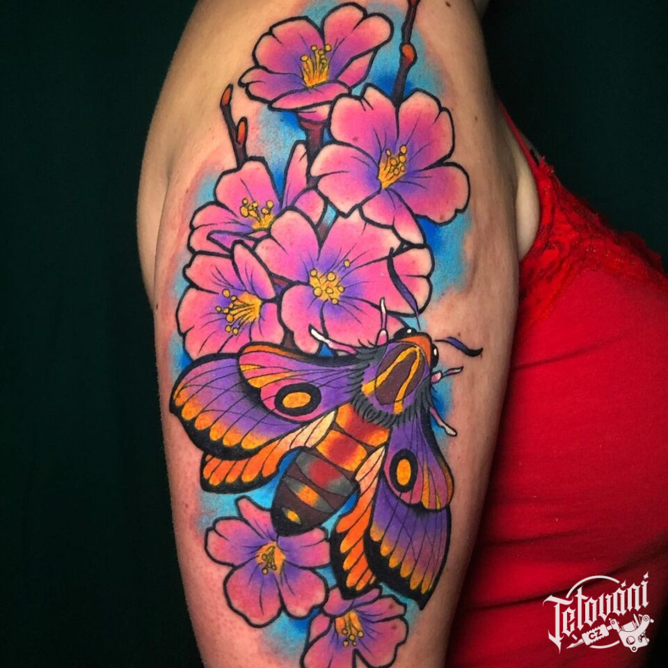 Tetování zvířata, můra na květinách na rameni