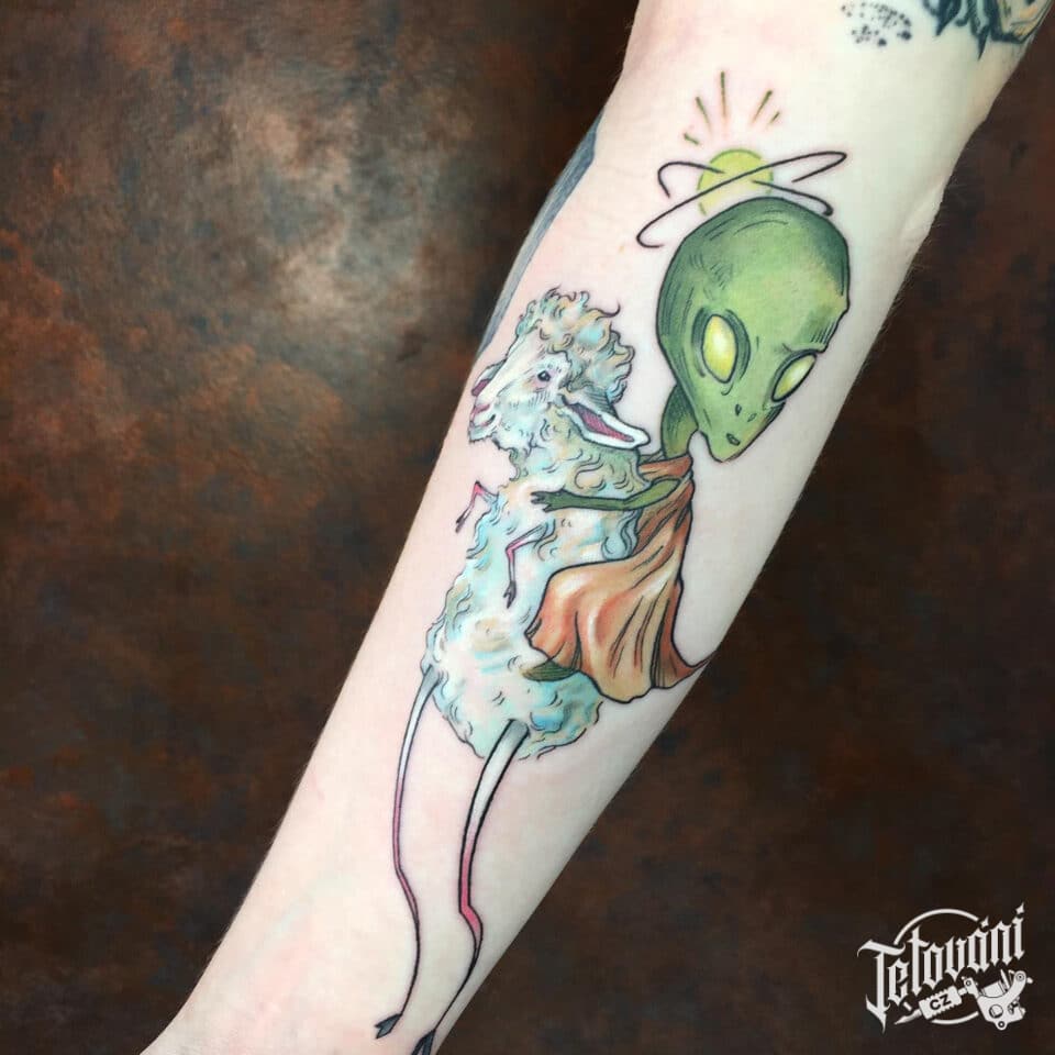 Tetování zvířata, ovce a nadpřirozené bytosti, ufo na předloktí