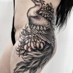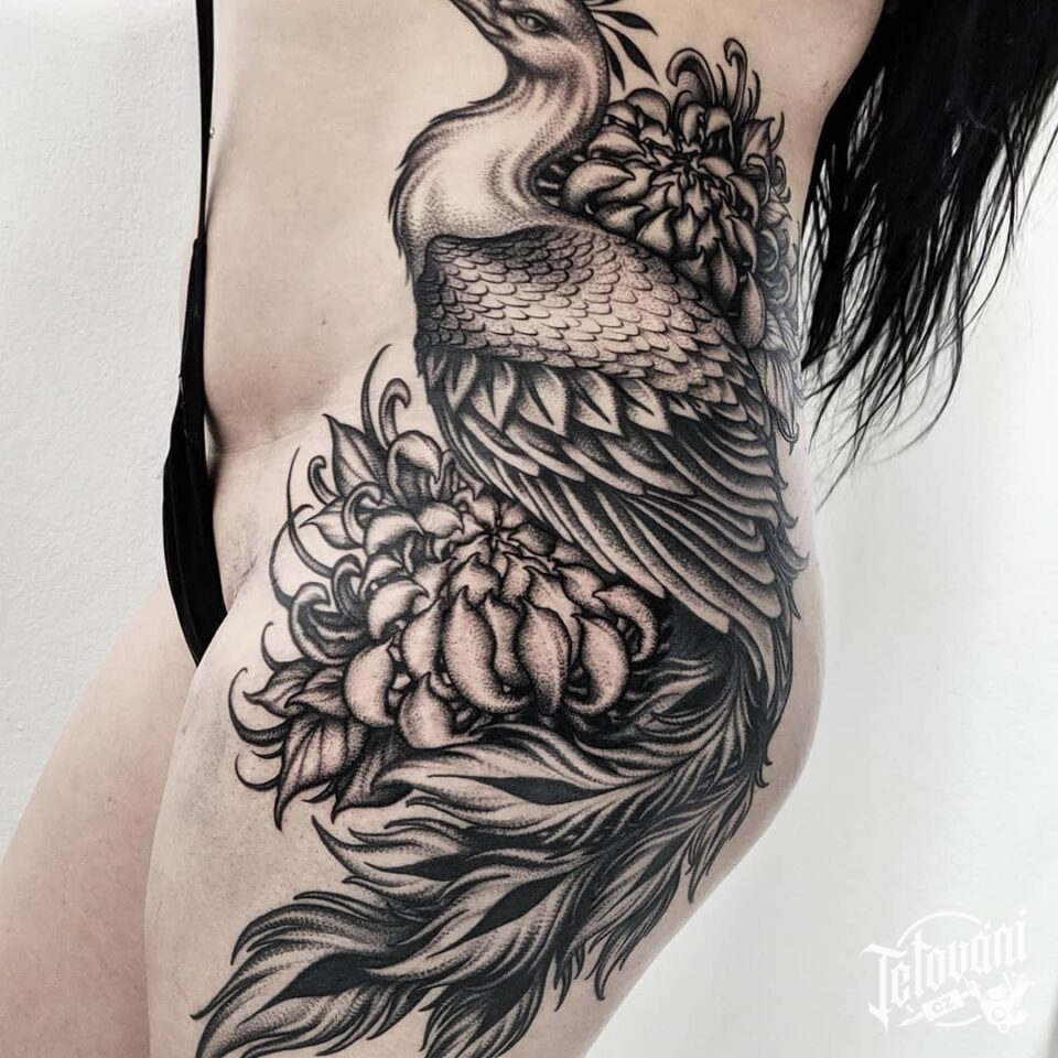Tetování zvířata, páv a květiny na boku