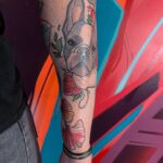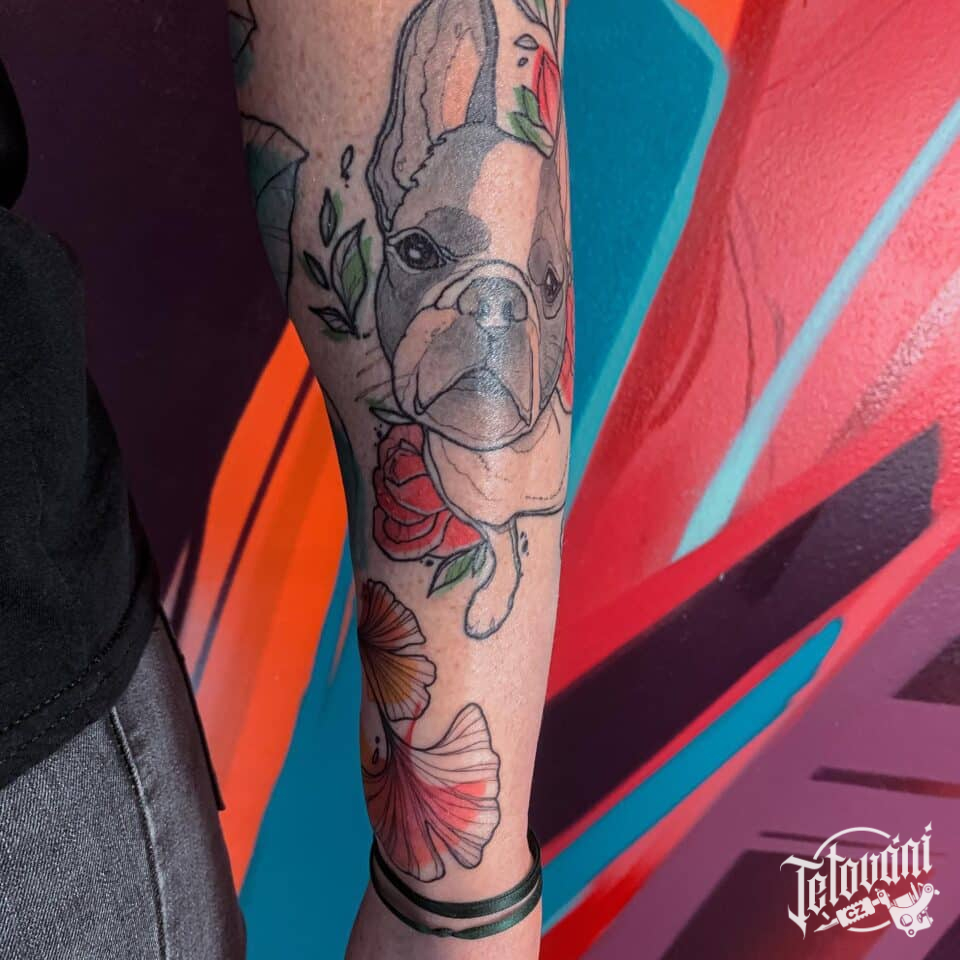 Tetování zvířata, pes a květiny na předloktí