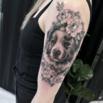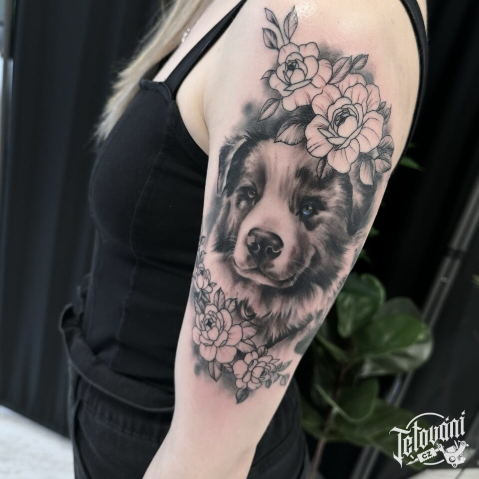 Tetování zvířata, pes a květiny na rameni