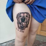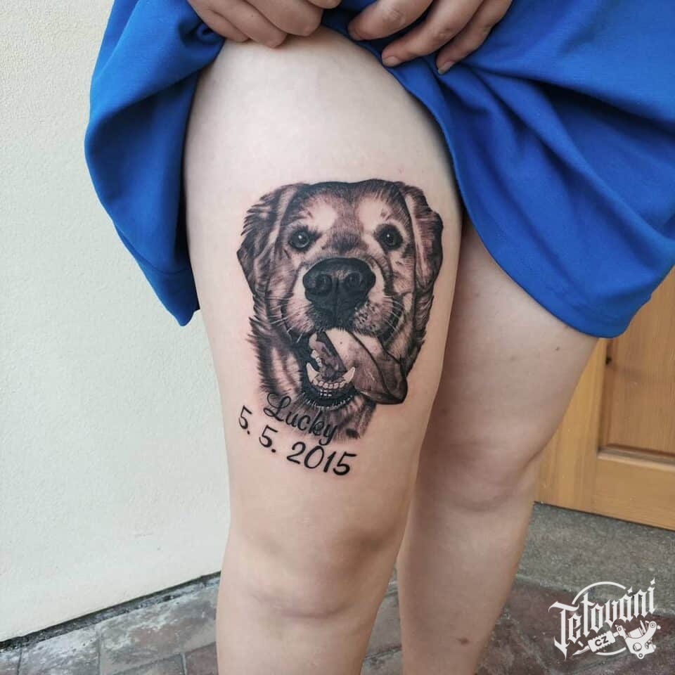 Tetování zvířata, pes a nápis, datum na stehnu