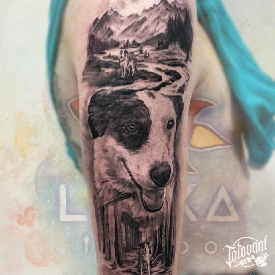 Tetování zvířata, pes a příroda, hory, les na rameni