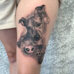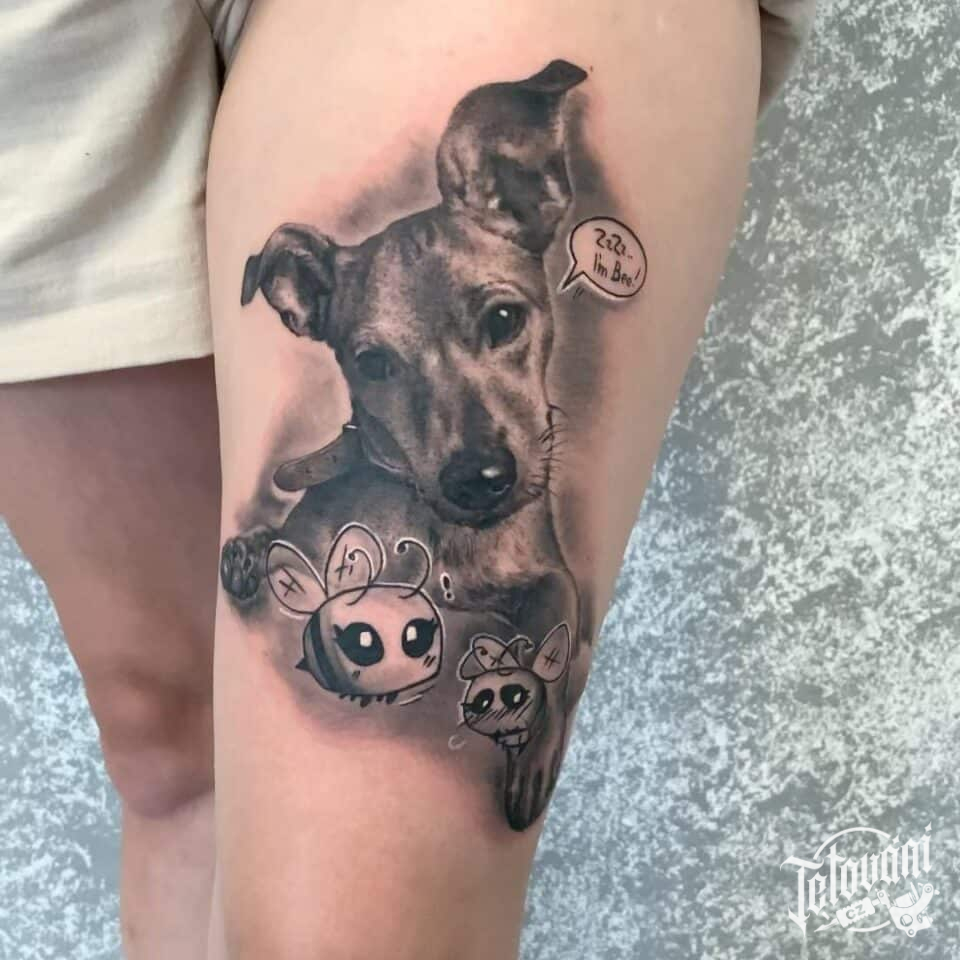 Tetování zvířata, pes a včely na stehnu