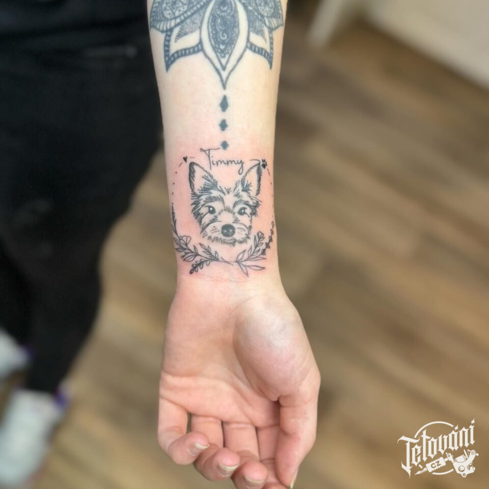 Tetování zvířata, pes, květiny a nápisy, jména na předloktí