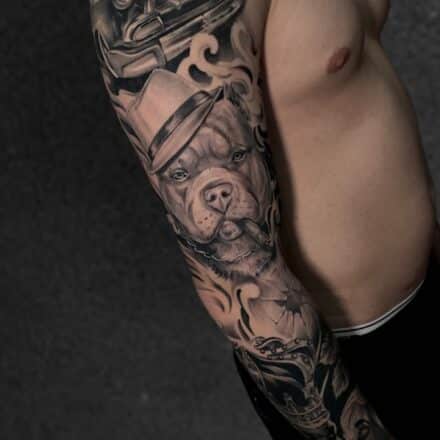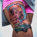 Tetování zvířata, pes, nápis a dopravní prostředky, auto na stehnu