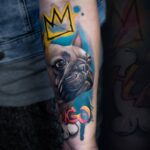 Tetování zvířata, pes, nápisy, jméno a koruna na předloktí