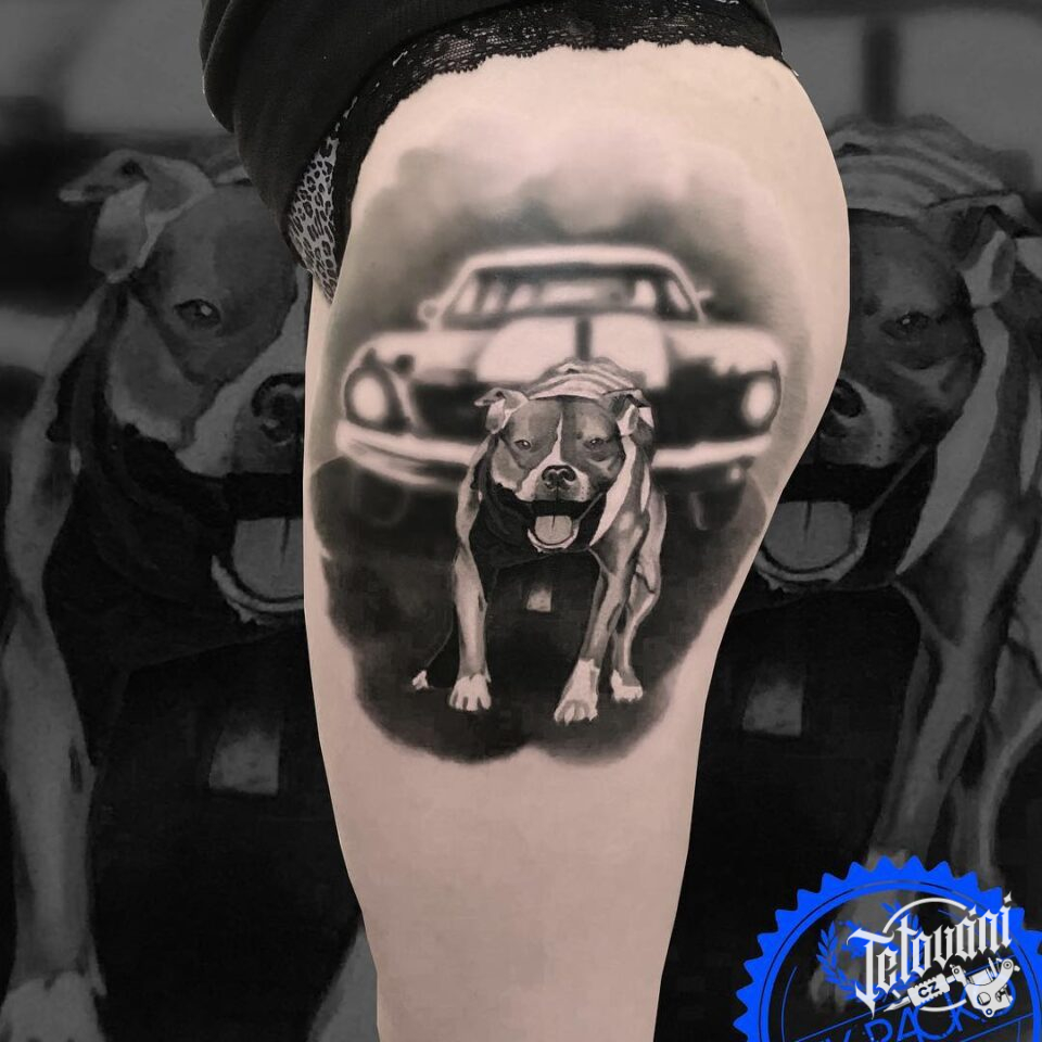 Tetování zvířata, pes před autem na stehně