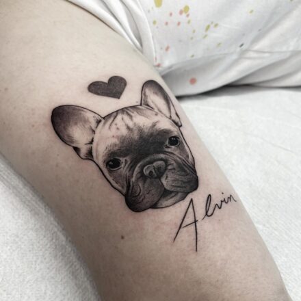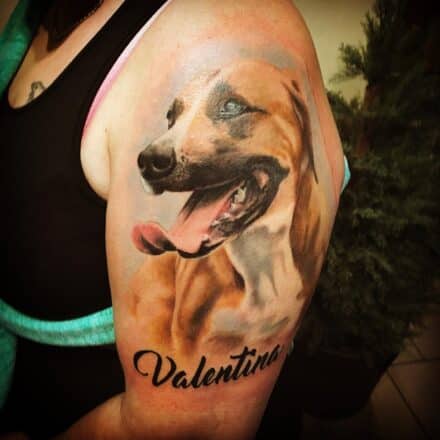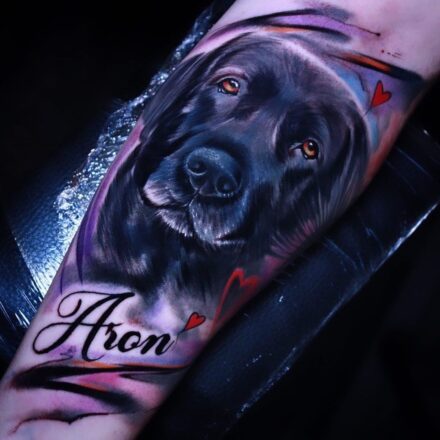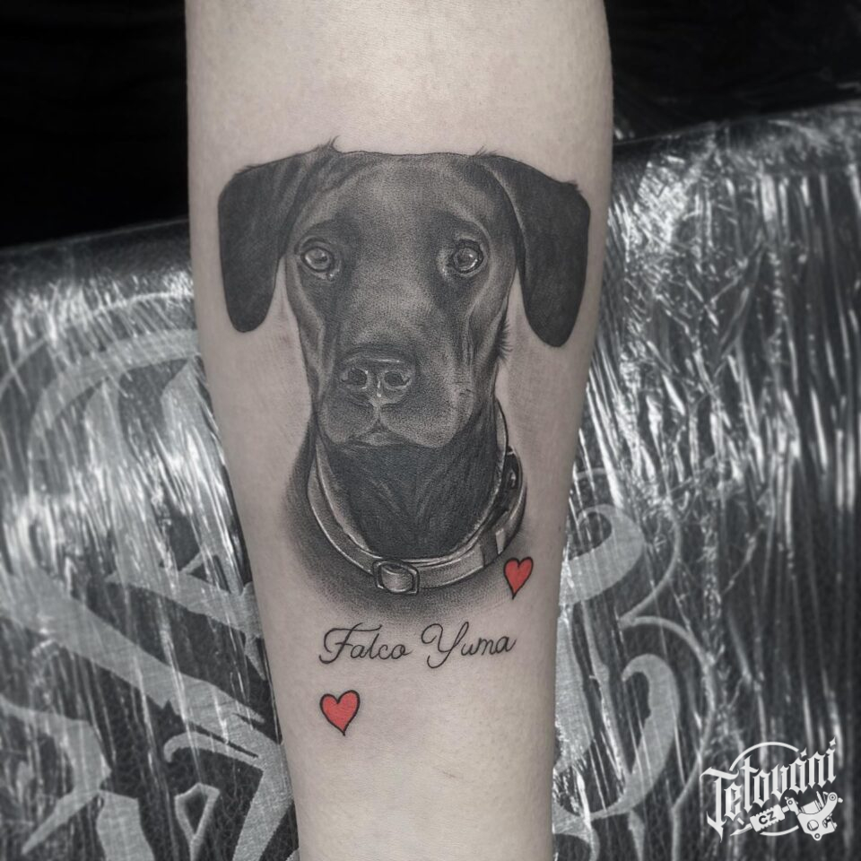 Tetování zvířata, pes, srdce a nápisy, jména na předloktí