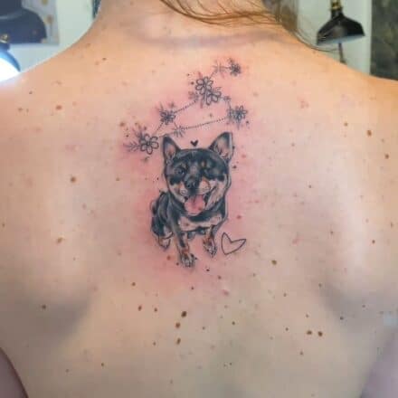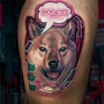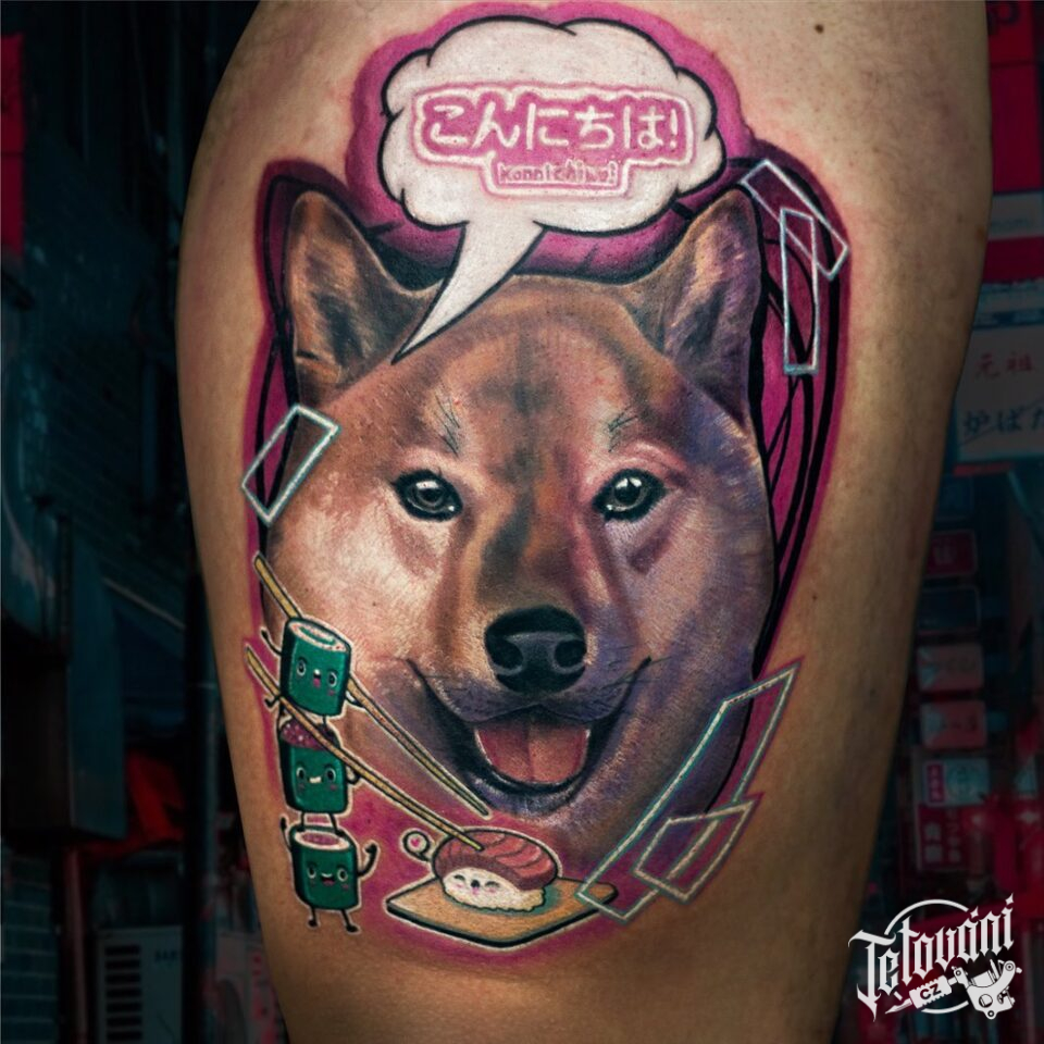 Tetování zvířata, pes, tvary, postavičky a nápis na stehnu