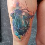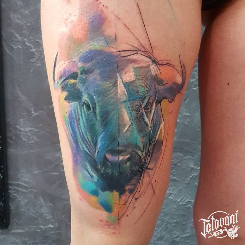Tetování zvířata, portrét býka na stehně