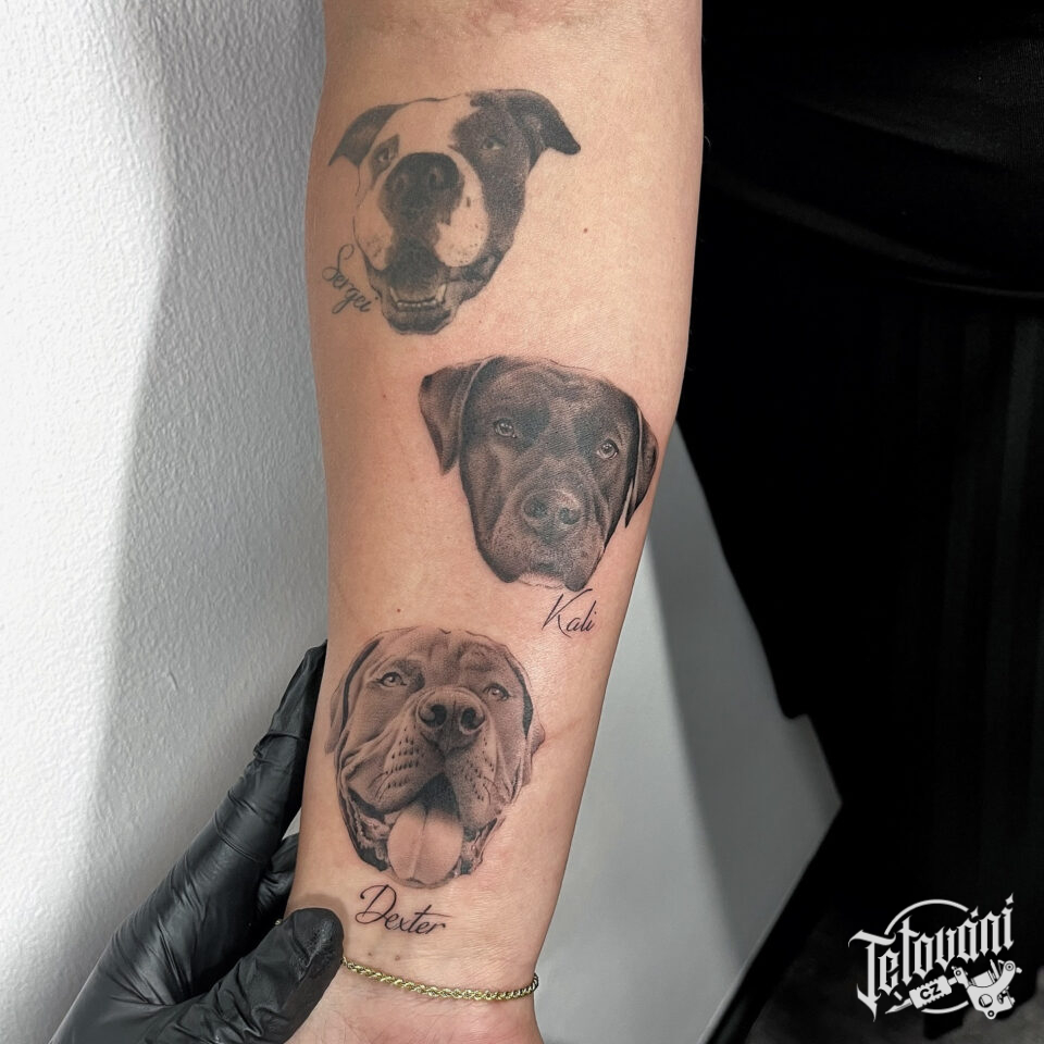 Tetování zvířata, psi a nápisy, jména na předloktí