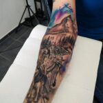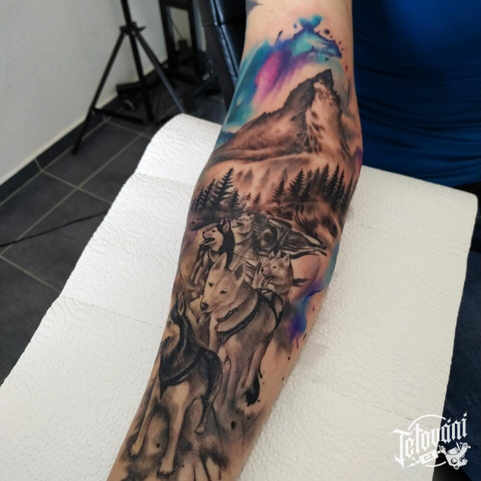Tetování zvířata psi, příroda hory na předloktí
