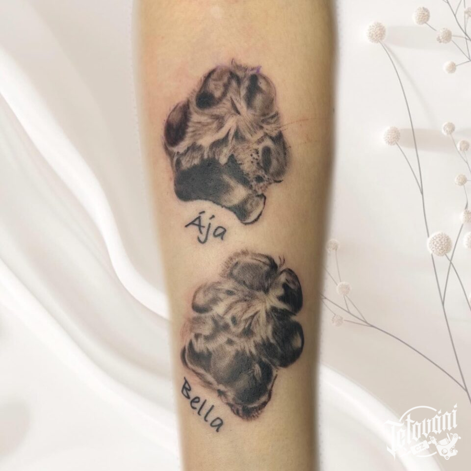 Tetování zvířata, psí tlapky se jmény na předloktí
