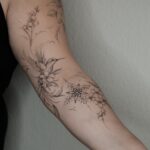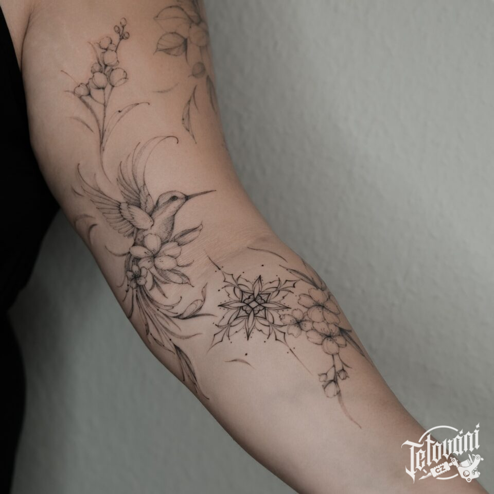 Tetování zvířata, ptáci, kolibřík a květiny na rukáv
