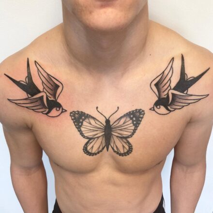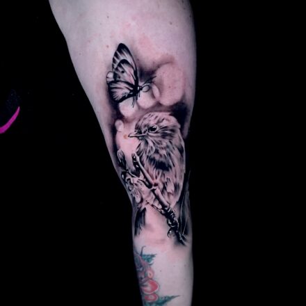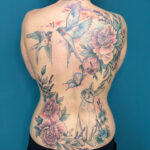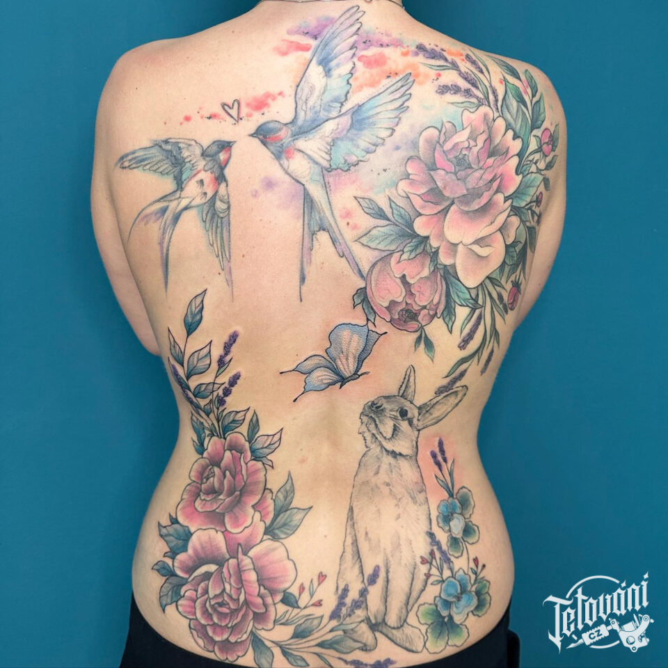 Tetování zvířata, ptáci, králík, motýl, květiny na zádech
