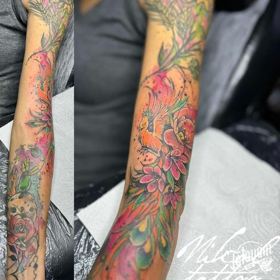 Tetování zvířata, ptáci, květiny na rukávu
