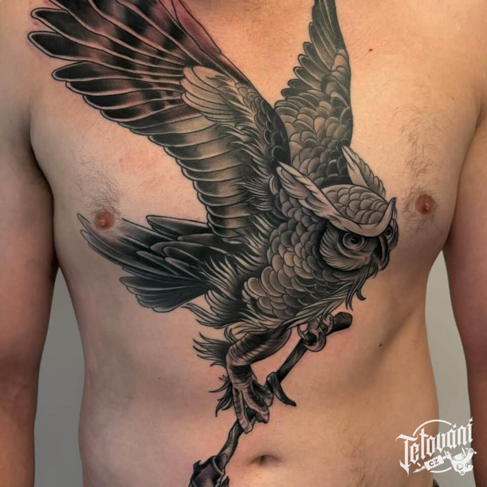 Tetování zvířata, ptáci, sova na hrudi a břichu