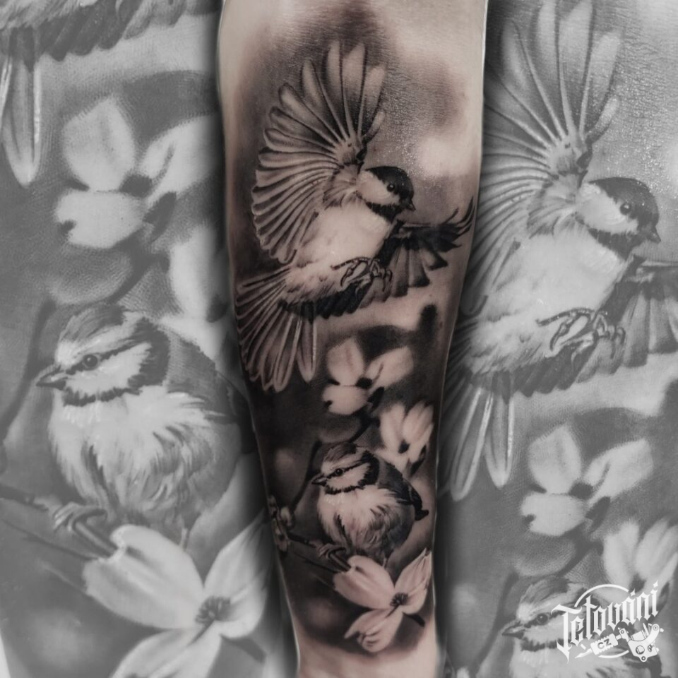 Tetování zvířata, ptáci, větvička na předloktí