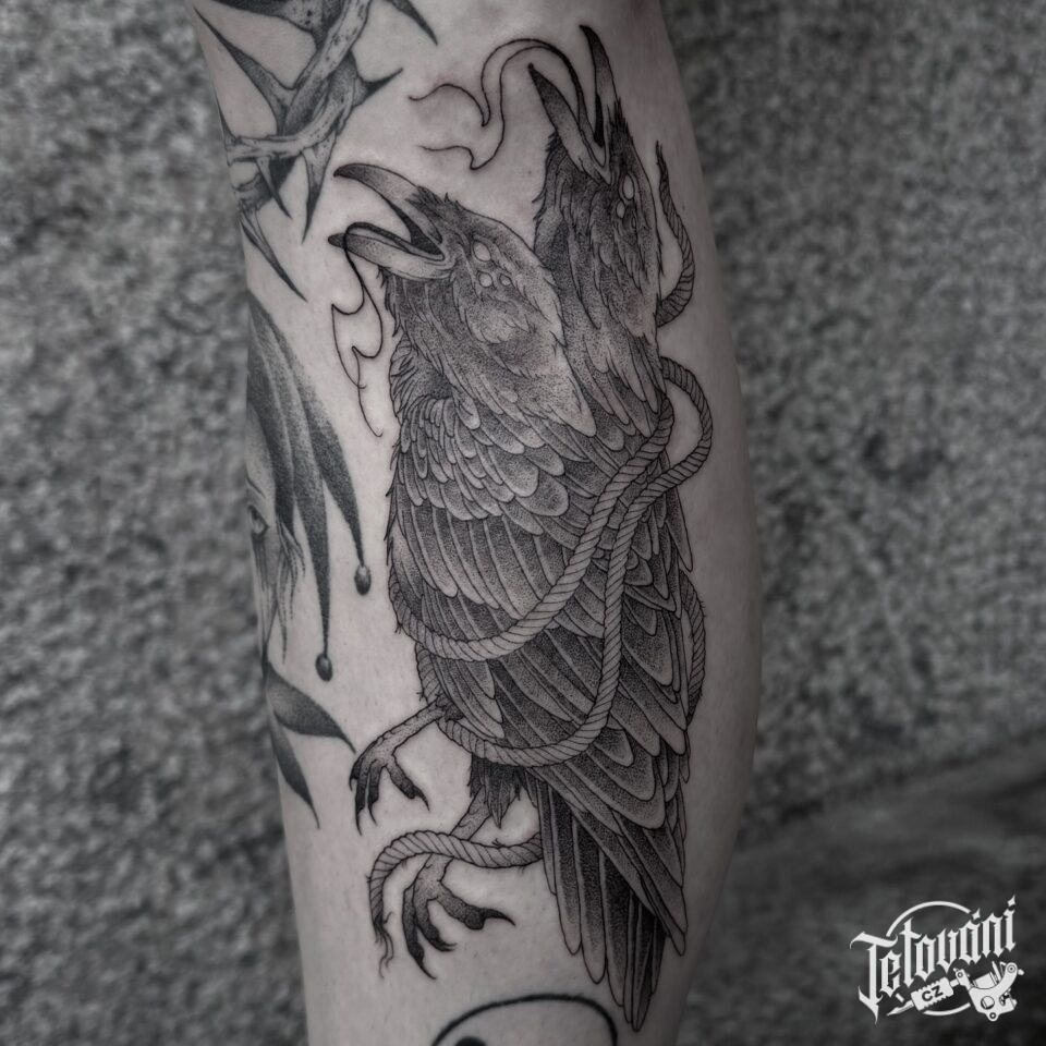 Tetování zvířata, ptáci, vrány na lýtku