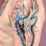 Tetování zvířata, pták a jelen, nápisy na rameni