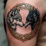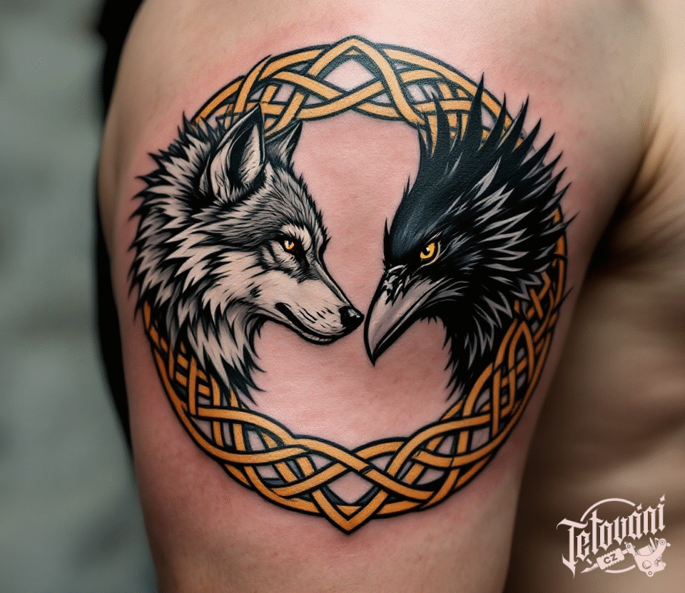 Tetování zvířata, pták a keltský vlk na rameni