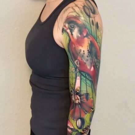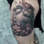 Tetování zvířata, pták a květiny na boku stehna