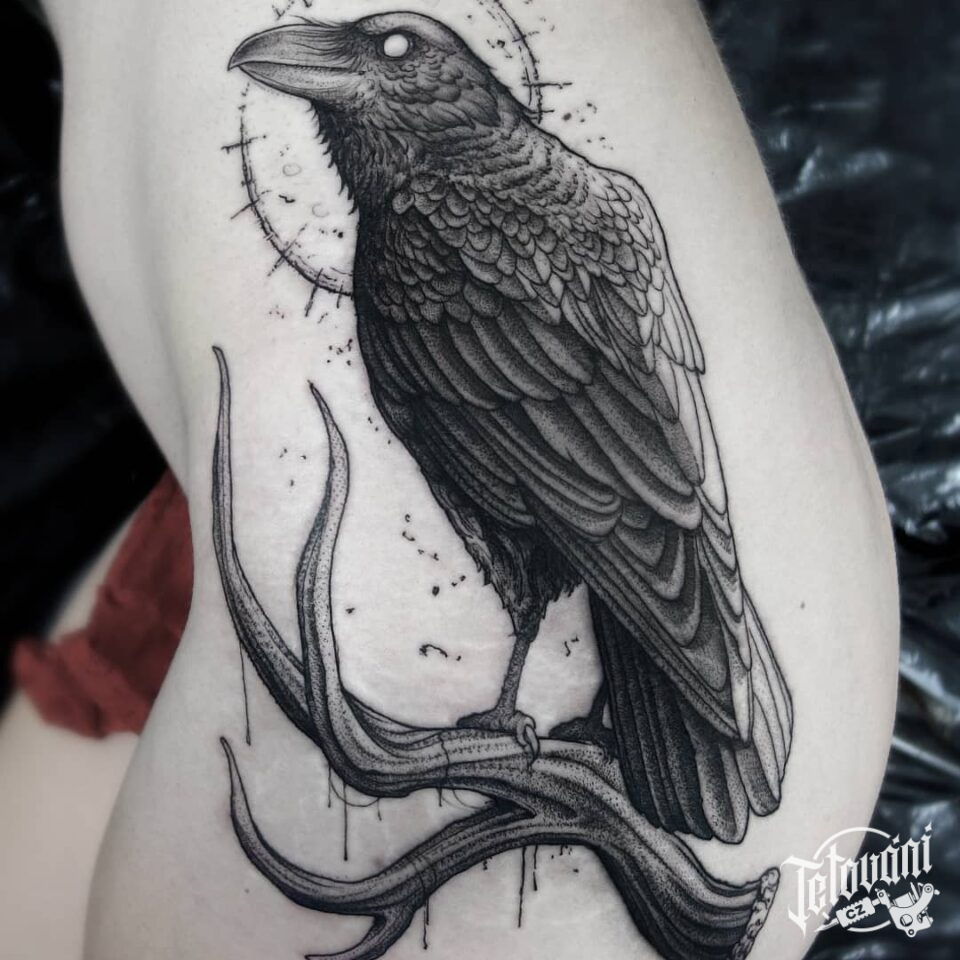 Tetování zvířata, pták, havran na boku
