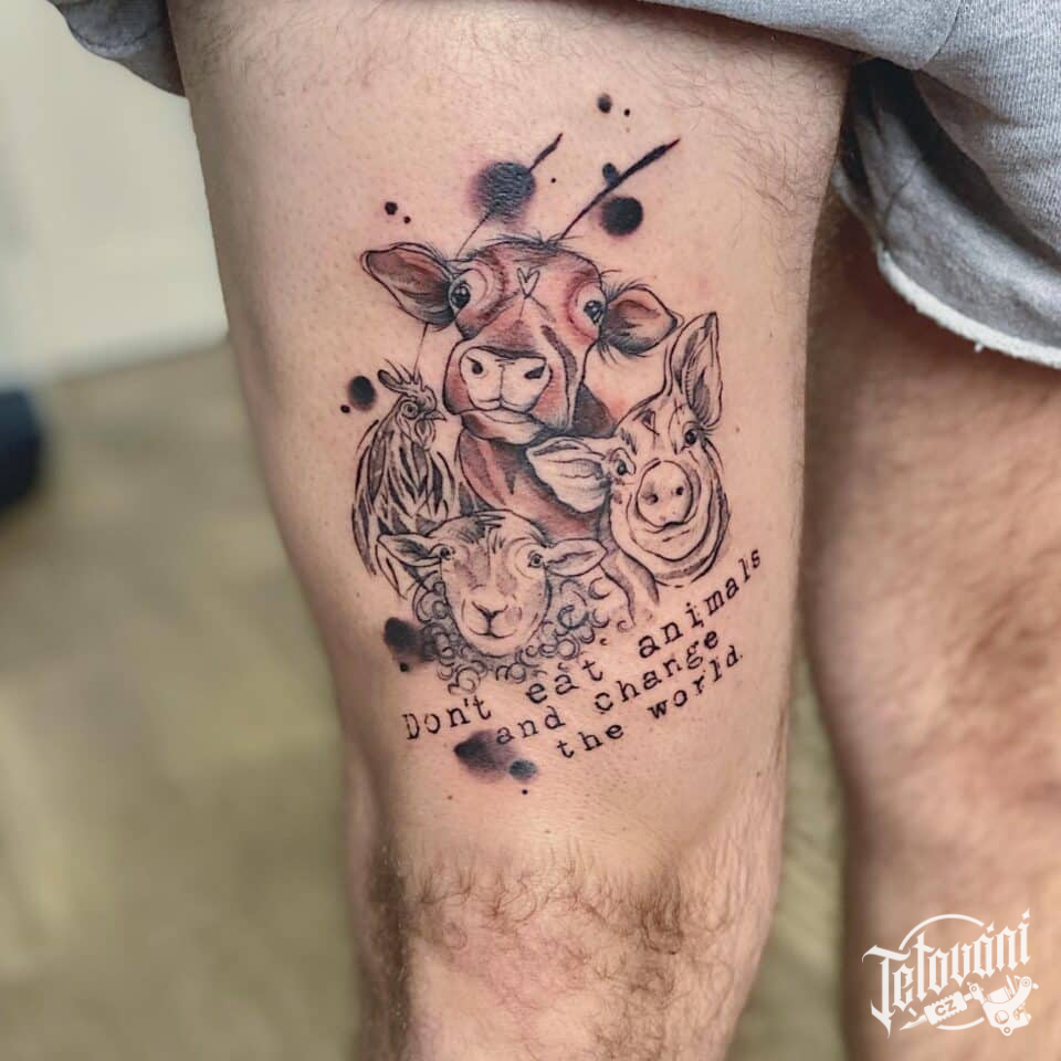 Tetování zvířata, pták, kohout, prasata, kráva a nápisy na stehně