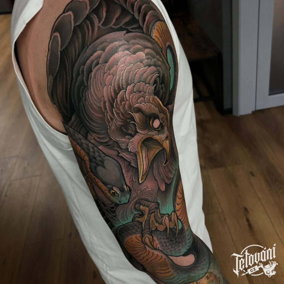 Tetování zvířata, pták, orel a had na rameni