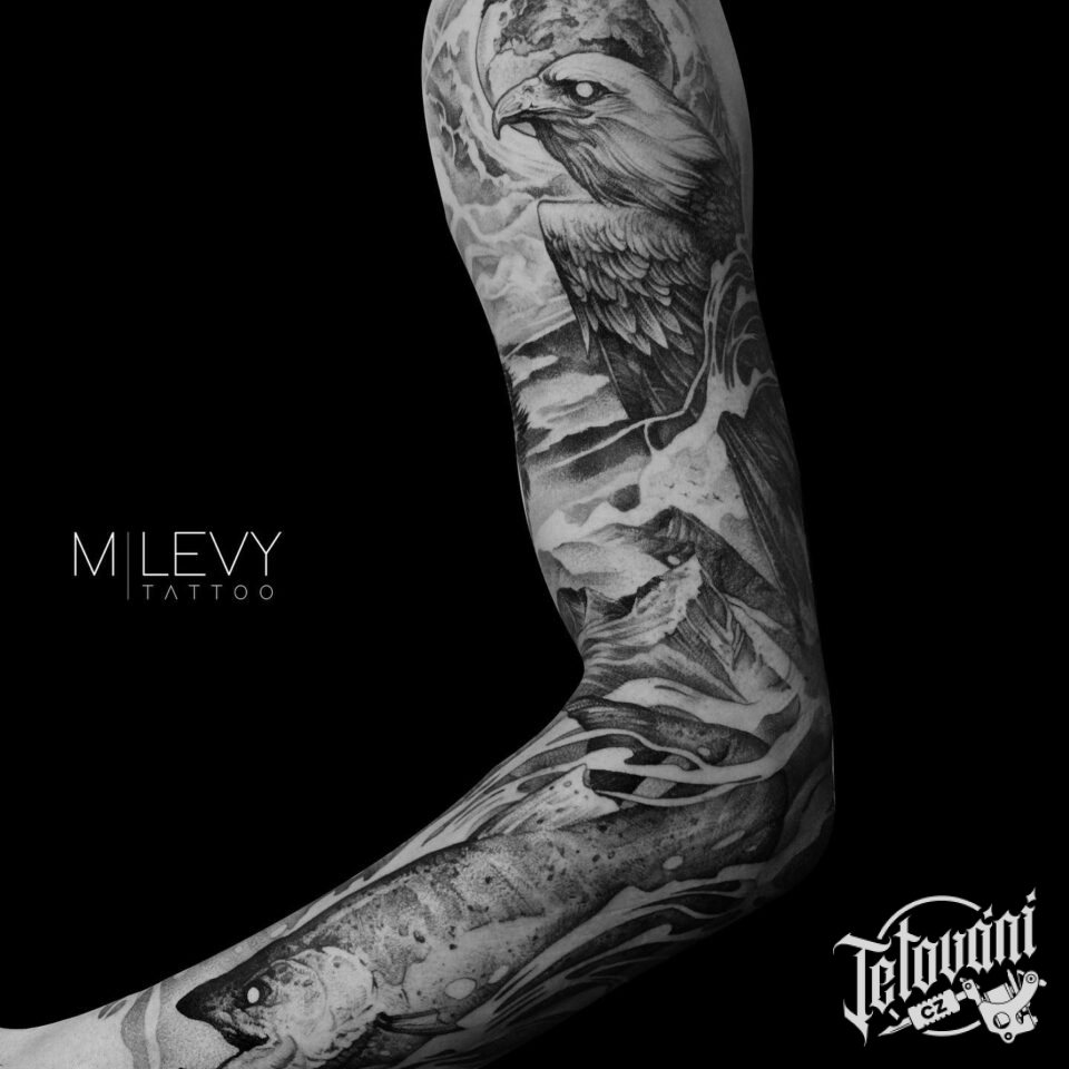 Tetování zvířata, pták, orel a ryba, rukáv