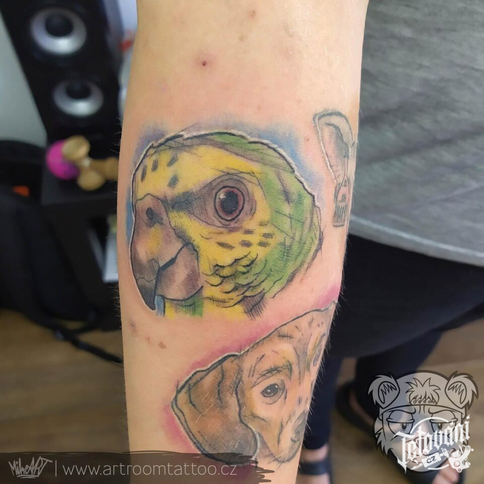 Tetování zvířata, pták, papoušek a pes na předloktí
