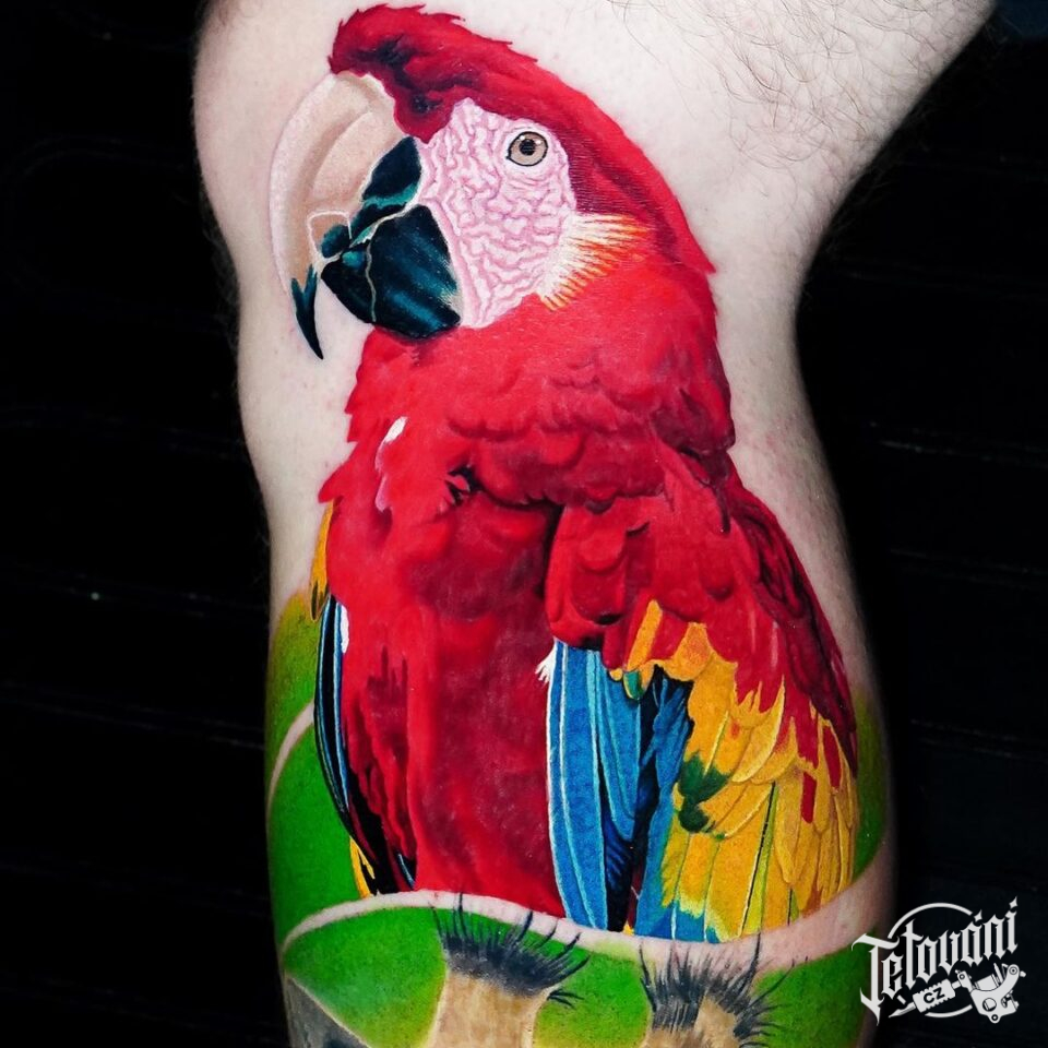 Tetování zvířata, pták, papoušek na lýtku