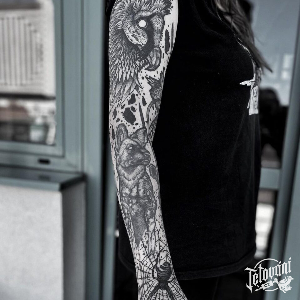 Tetování zvířata, pták, pes, pavouk, rukáv