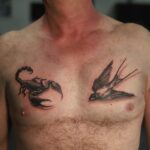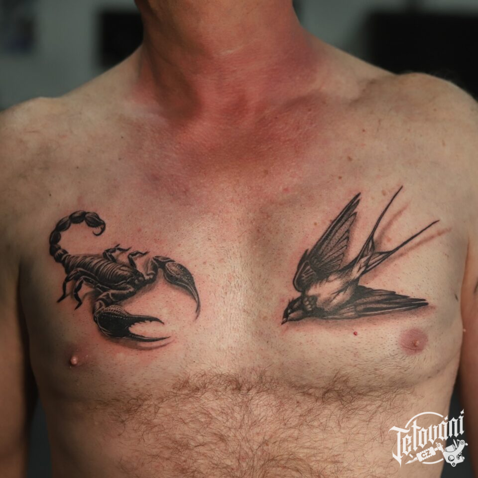 Tetování zvířata, pták, vlaštovka a škorpion na hrudi
