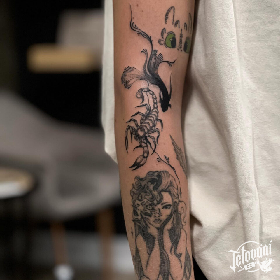 Tetování zvířata, škorpion, ryba a štír znamení zvěrokruhu na loket