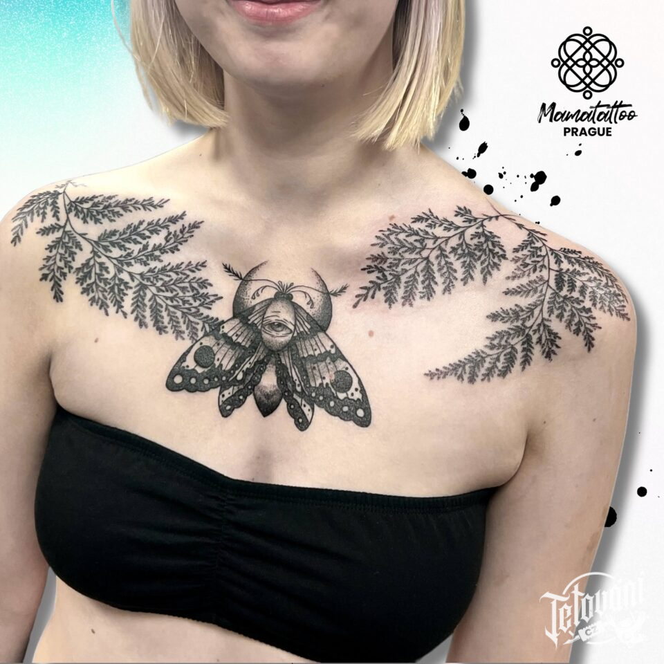 Tetování zvířata smrtihlav, oko a květiny na hrudníku